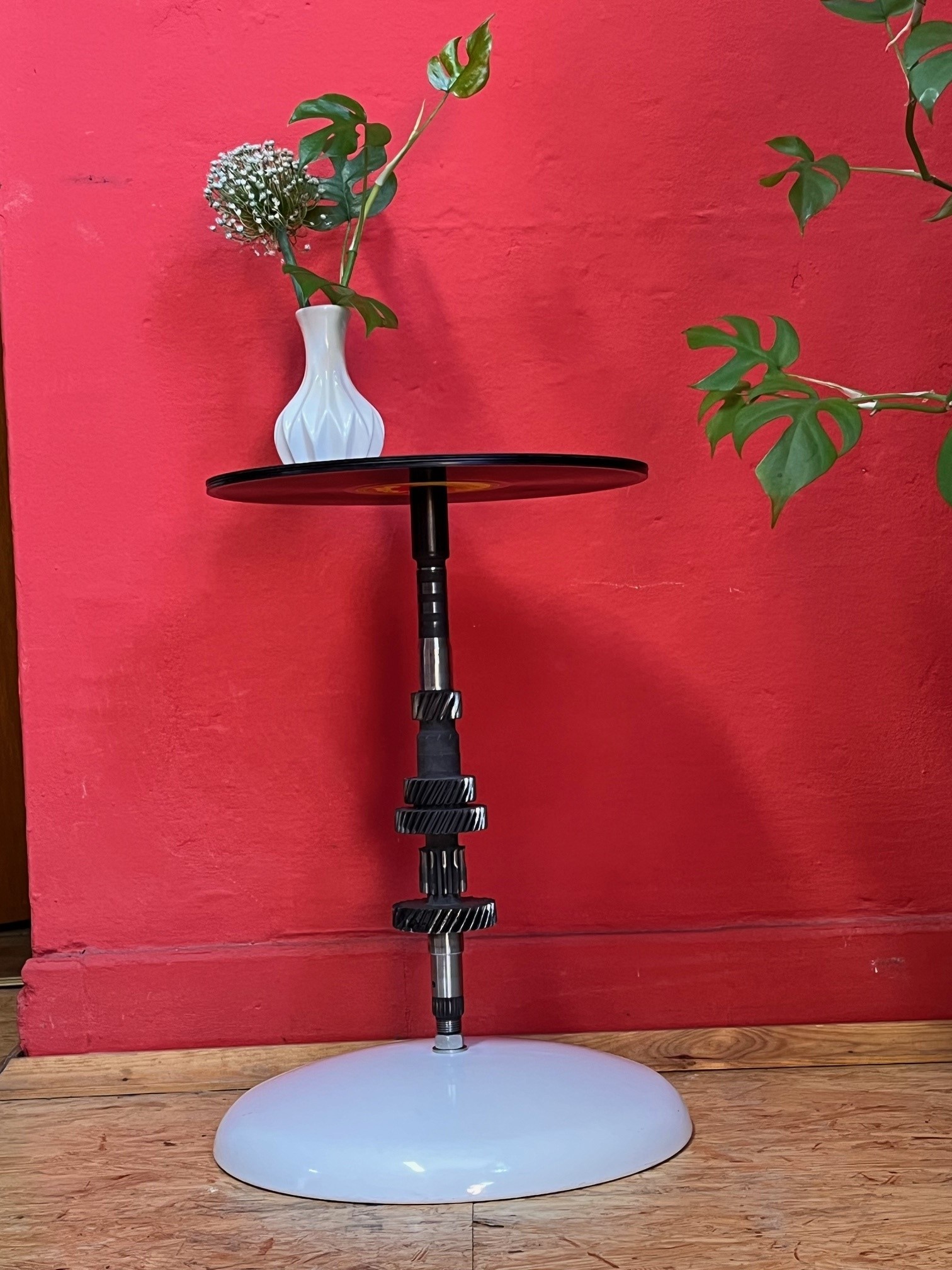 Material :  Fundstücke aus einer Kfz-Werkstatt und verklebte und klar lackierte Schallplatten